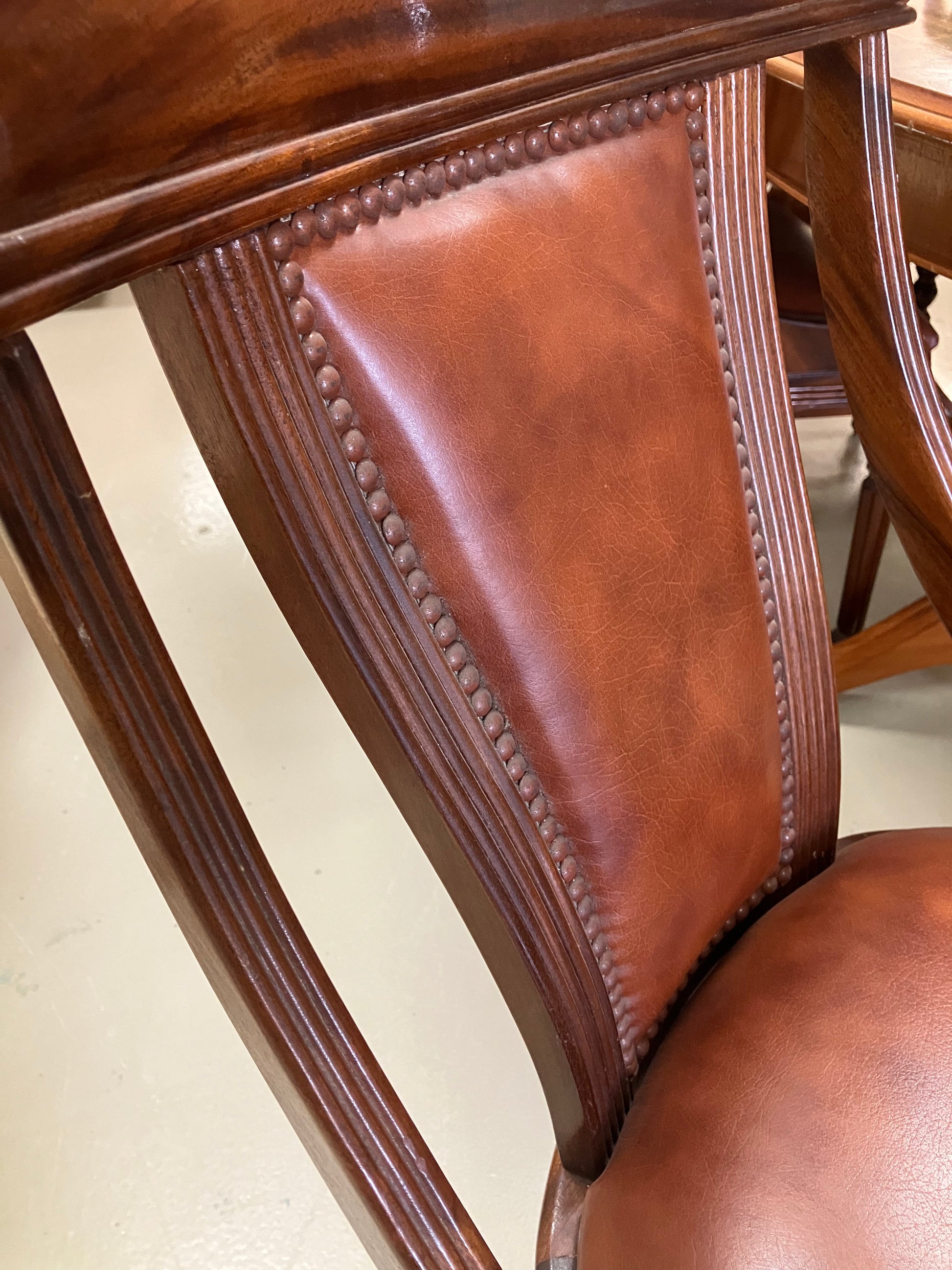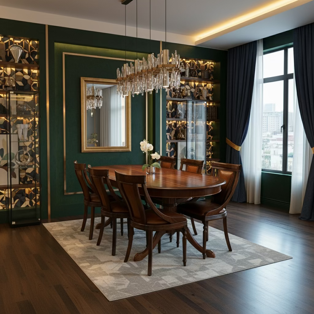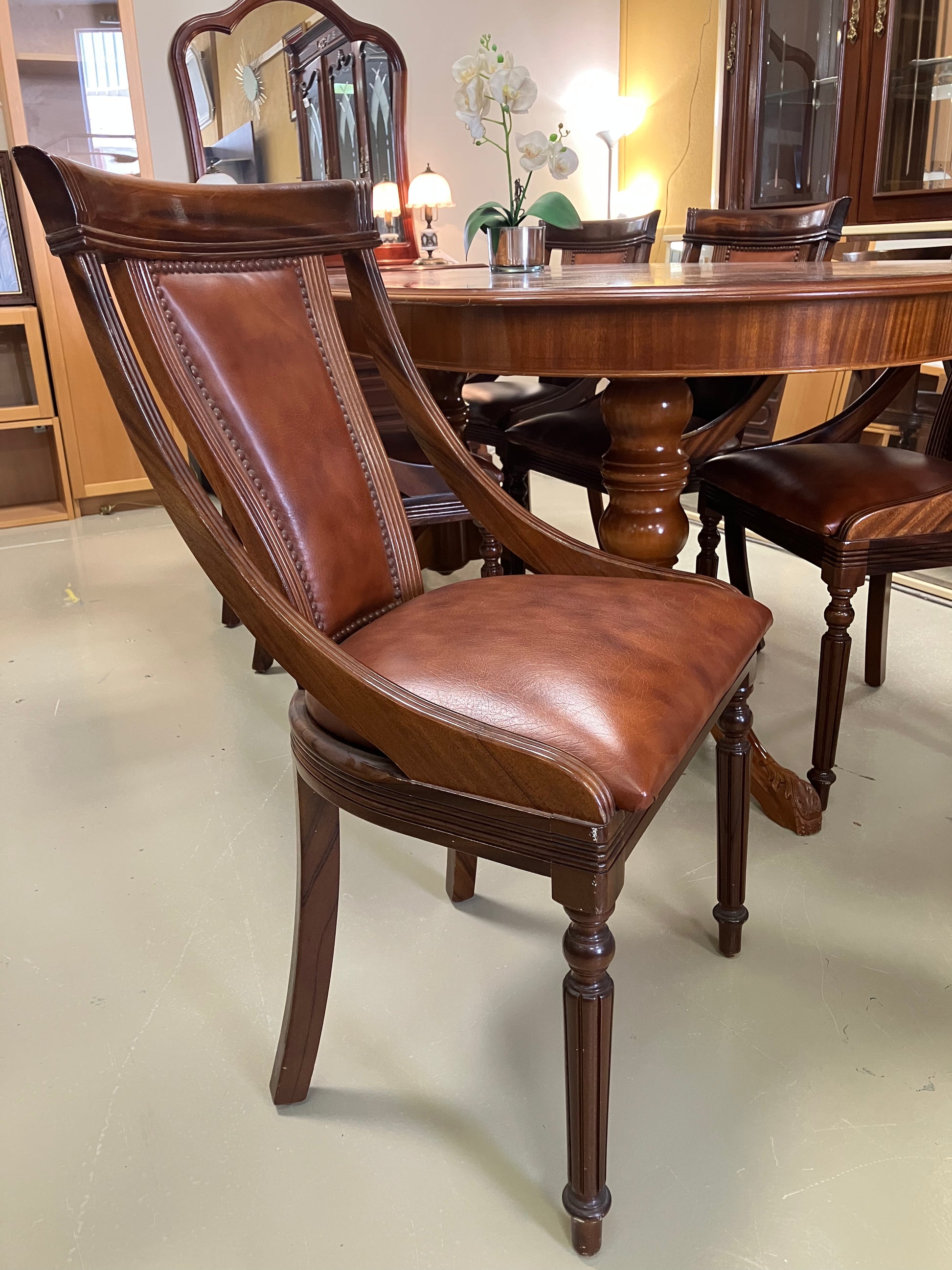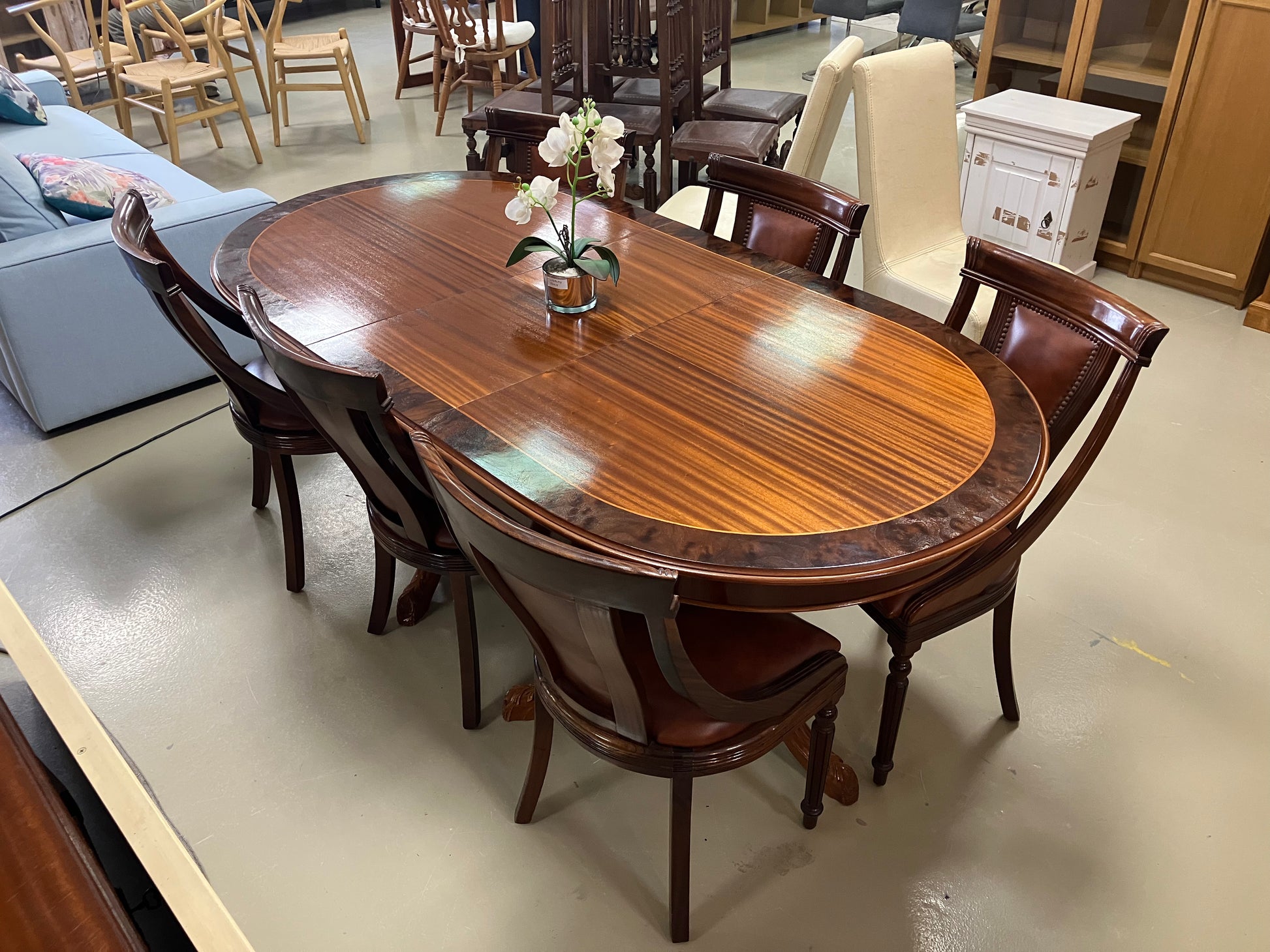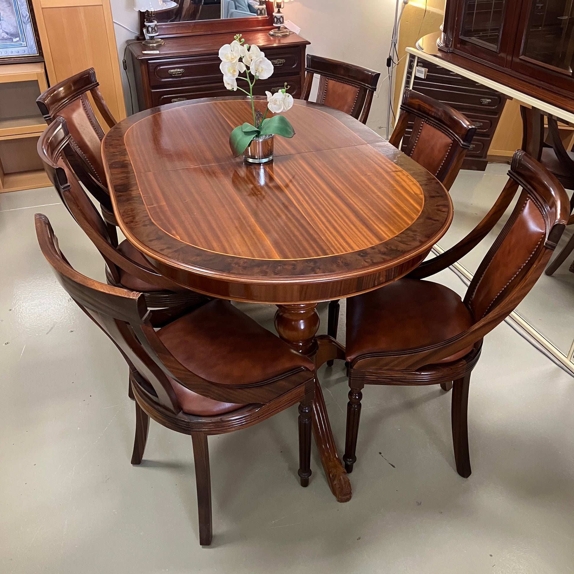 Uma deslumbrante mesa de jantar oval extensível com veios de madeira nobres e acabamento brilhante, combinada com seis elegantes cadeiras de encosto alto. O trabalho artesanal e os detalhes curvos conferem um toque de sofisticação intemporal — perfeita para jantares formais ou eventos especiais.