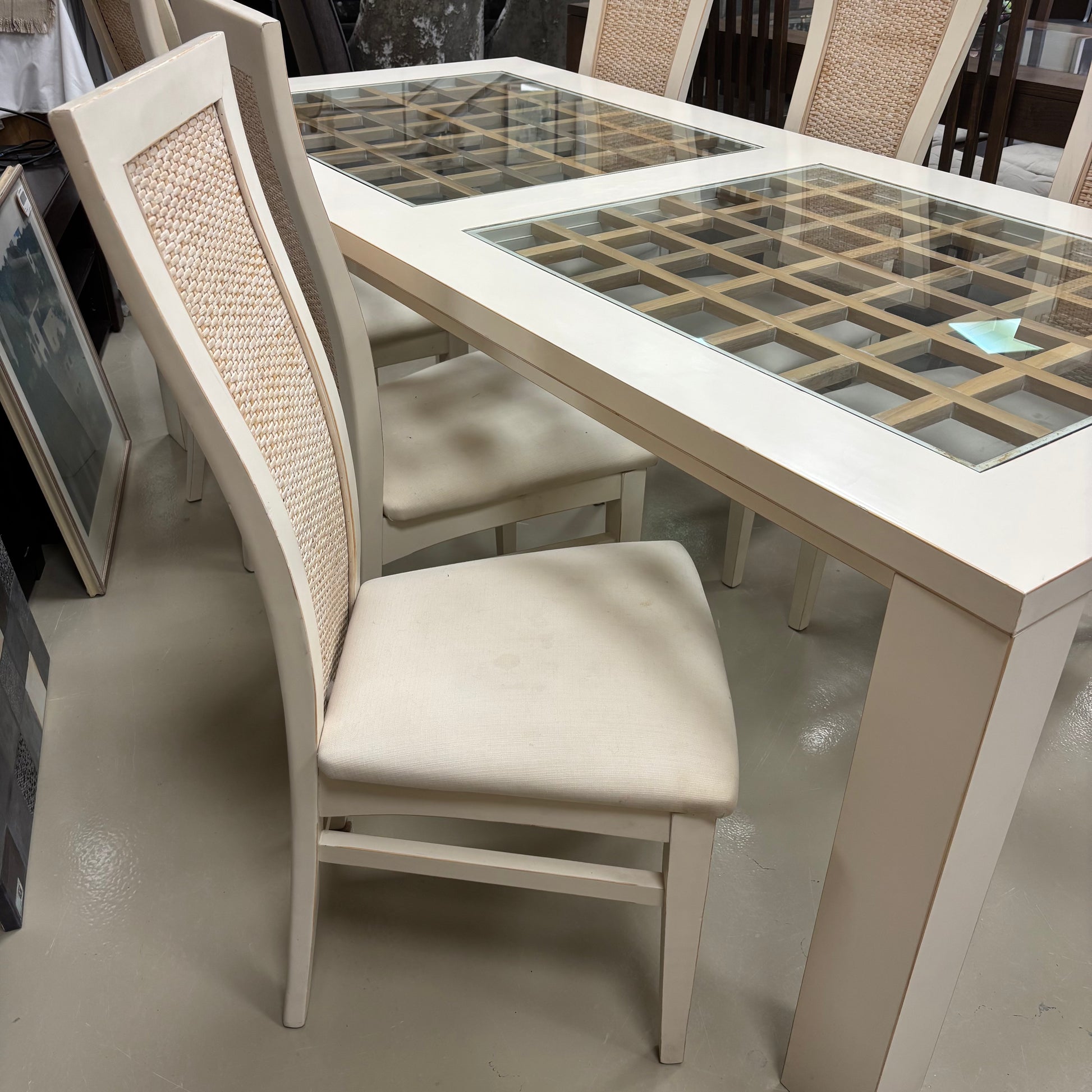 Large white dining table with glass panel detailing and six matching chairs. A striking set ideal for entertaining.