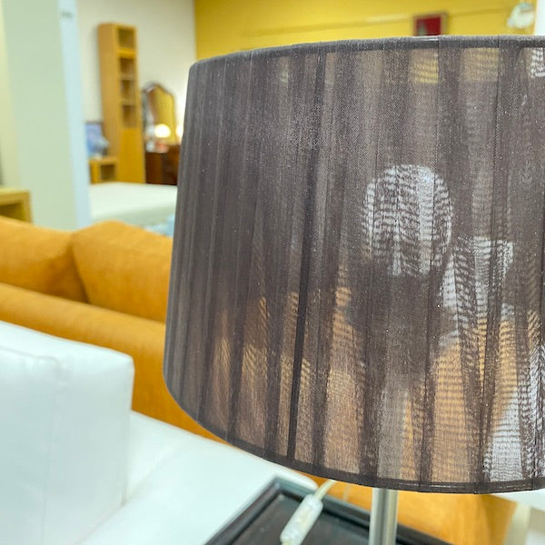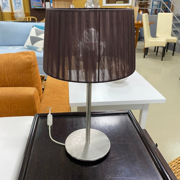 Um candeeiro clássico com base em metal prateado e cúpula plissada transparente em tom castanho chocolate escuro.