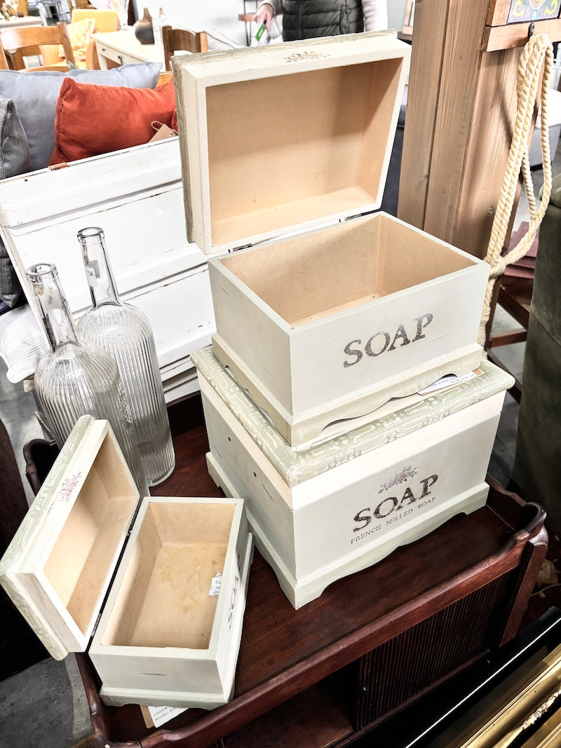 Conjunto de três caixas de madeira de estilo vintage, pintadas em tons de verde sálvia.