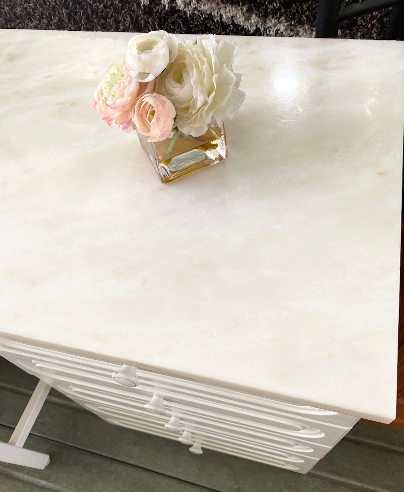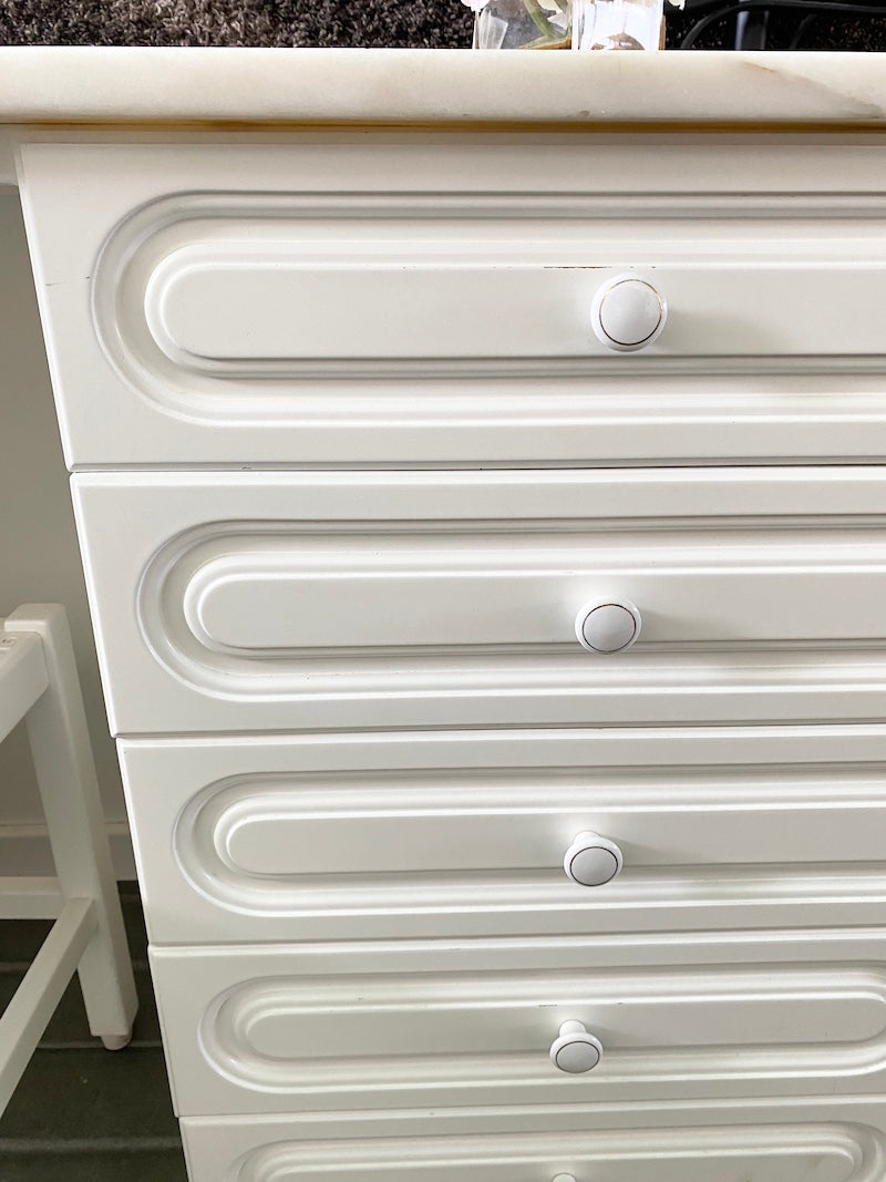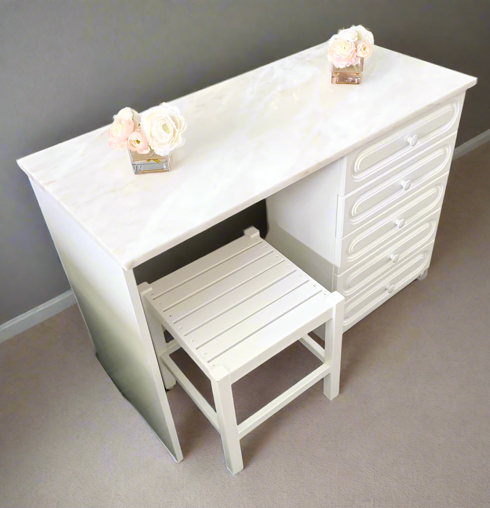 Esta elegante penteadeira branca apresenta um tampo de mármore creme liso, combinando a beleza clássica com uma funcionalidade duradoura. Inclui cinco gavetas espaçosas, proporcionando um amplo espaço para organizar os seus cosméticos, acessórios e artigos de higiene essenciais de forma eficiente. Note que o banco é vendido em separado.
