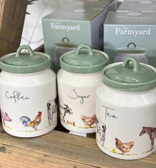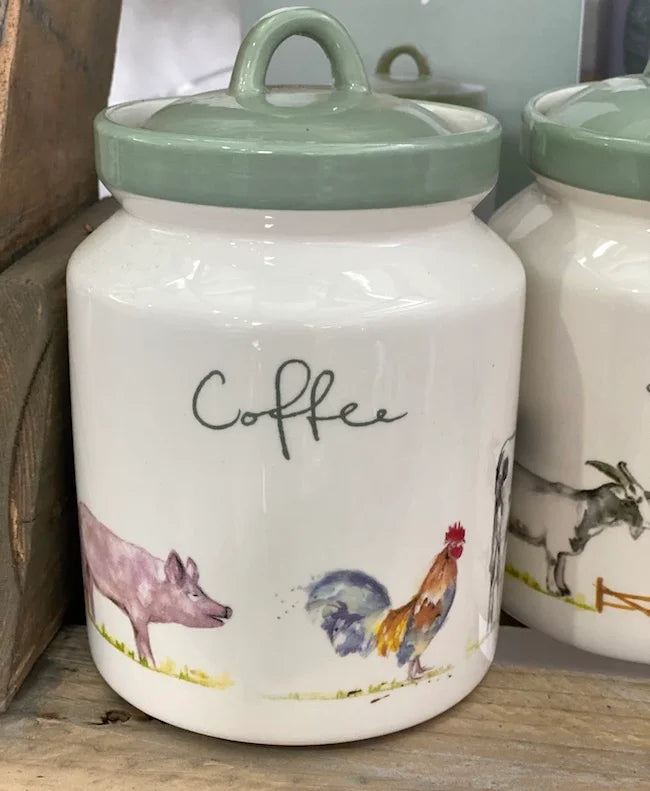 Uma lata de café de cerâmica da coleção The Farmyard com animais de fazenda.