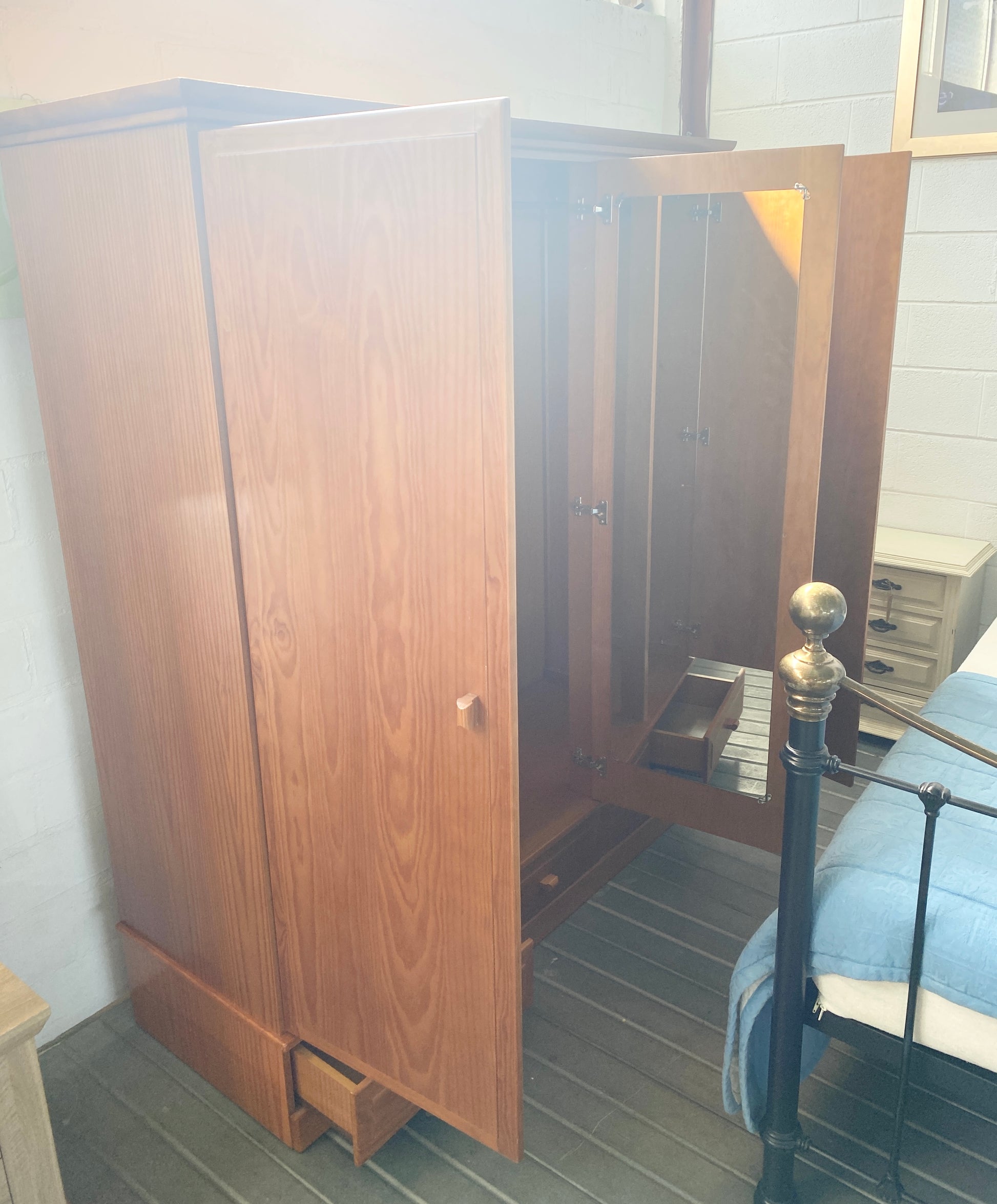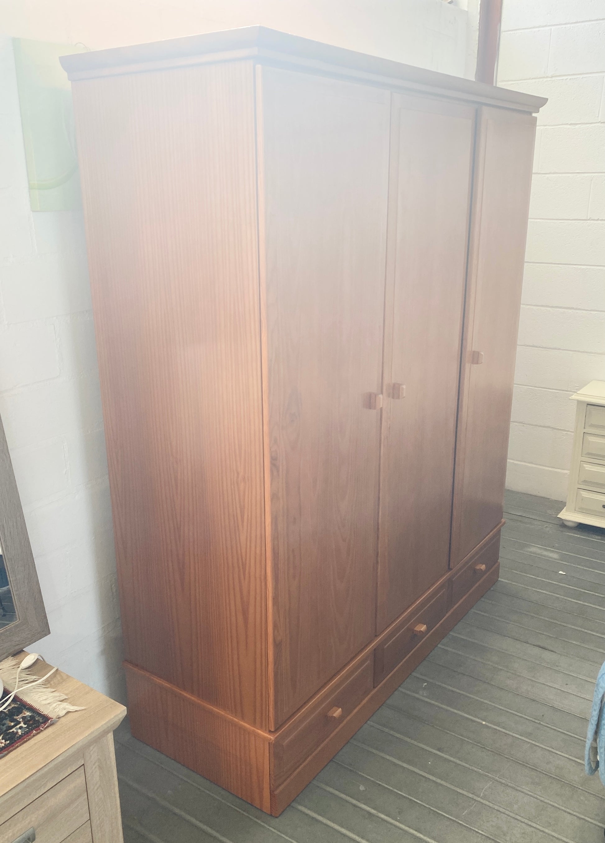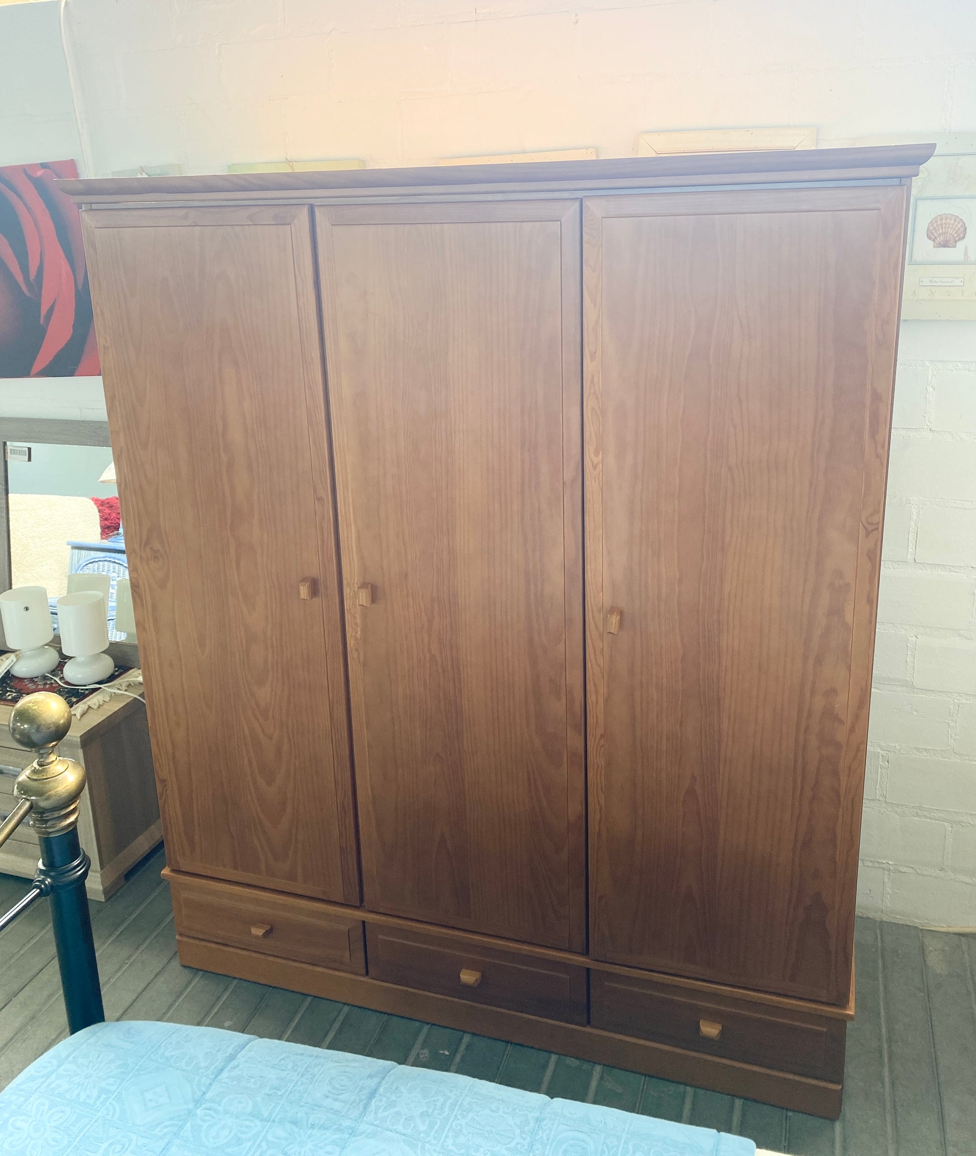 Um espaçoso roupeiro de madeira com três portas, cada uma delas com acesso a um único bengaleiro que acomoda muitas peças de roupa. Uma das portas tem um espelho no interior, e o roupeiro tem três gavetas deslizantes na parte inferior.