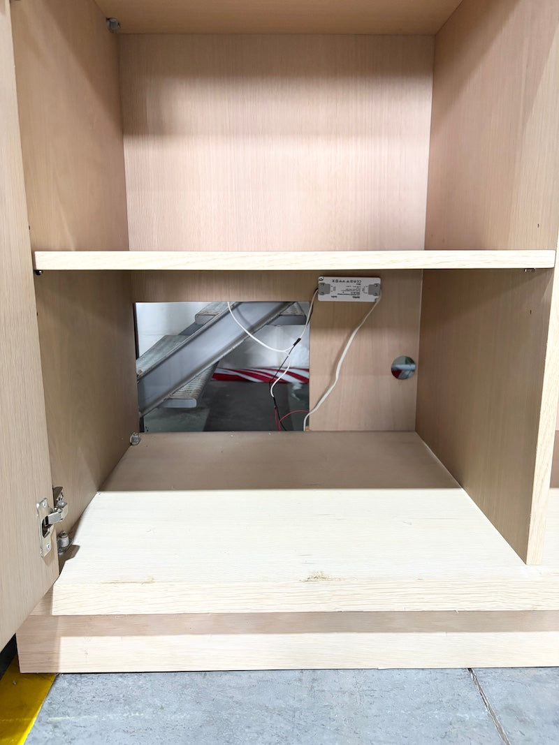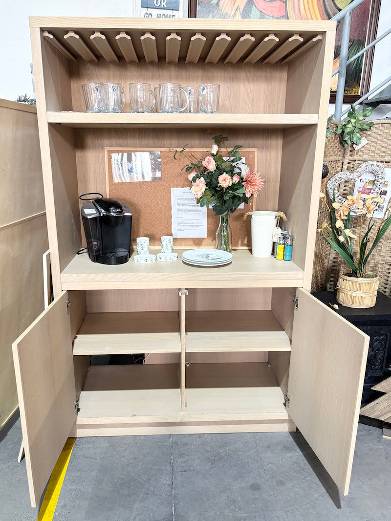 Este é um armário folheado a madeira com um suporte para copos na prateleira superior, uma prateleira para expor garrafas ou preparar bebidas e um armário inferior com bastante espaço de arrumação. As portas dos armários abrem com um elegante mecanismo de pressão e existe um orifício no canto inferior esquerdo para a passagem de cabos, uma vez que um dos armários pode ser utilizado para acomodar um pequeno frigorífico.