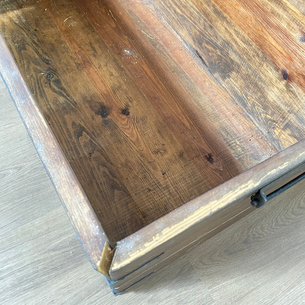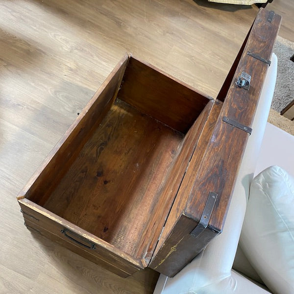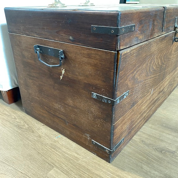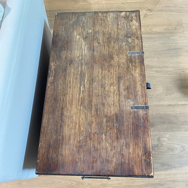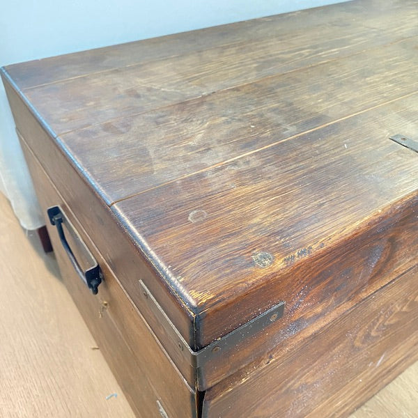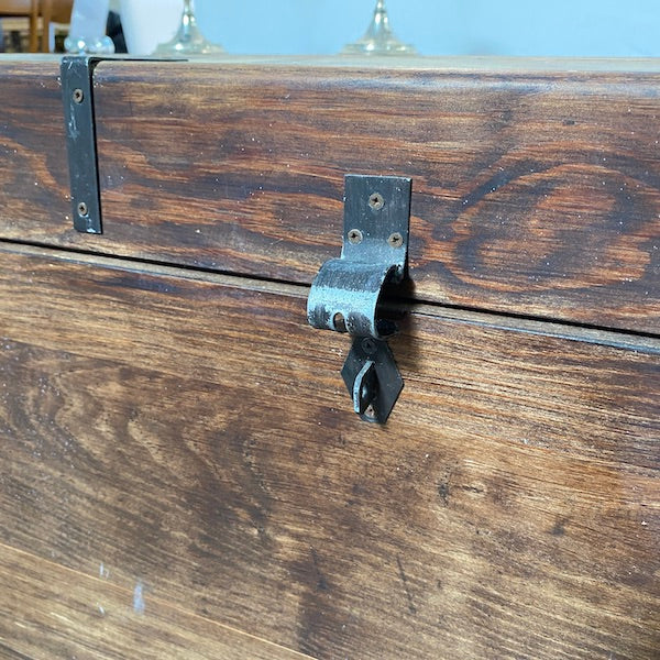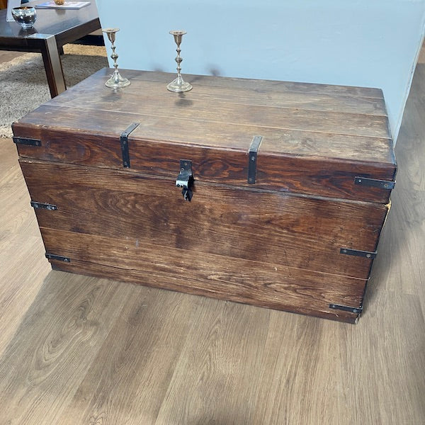 Um baú clássico de madeira maciça com muito espaço para guardar brinquedos, roupa de cama, revistas e livros, se for utilizado como mesa de centro. Um dos lados soltou-se um pouco no canto e seria bom usar um ou dois pregos se não conseguirmos! Pode trancá-lo com um cadeado.