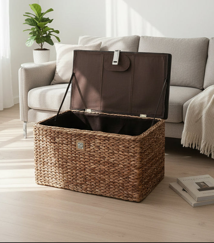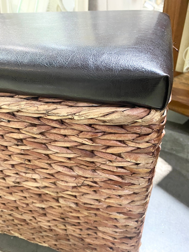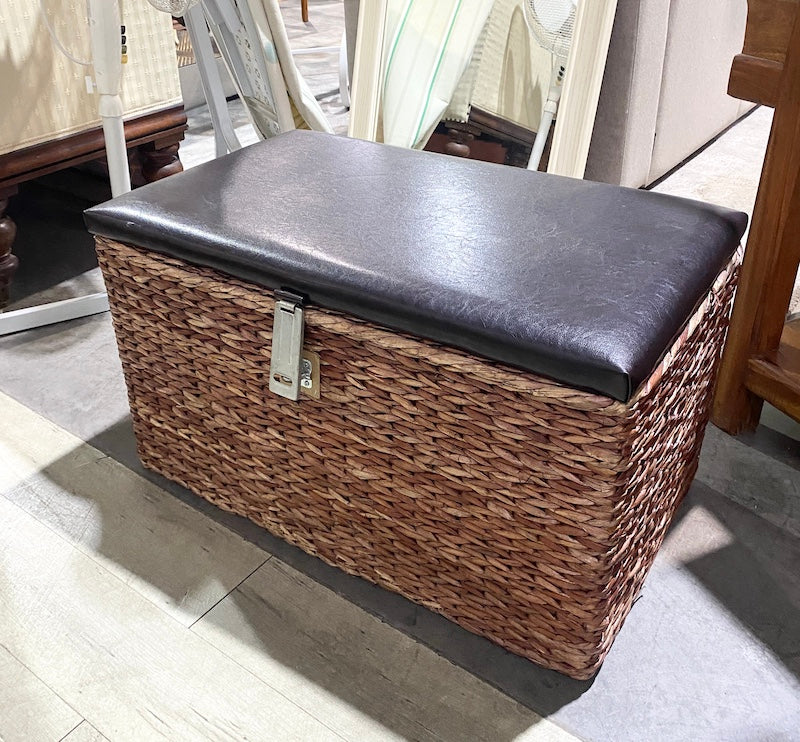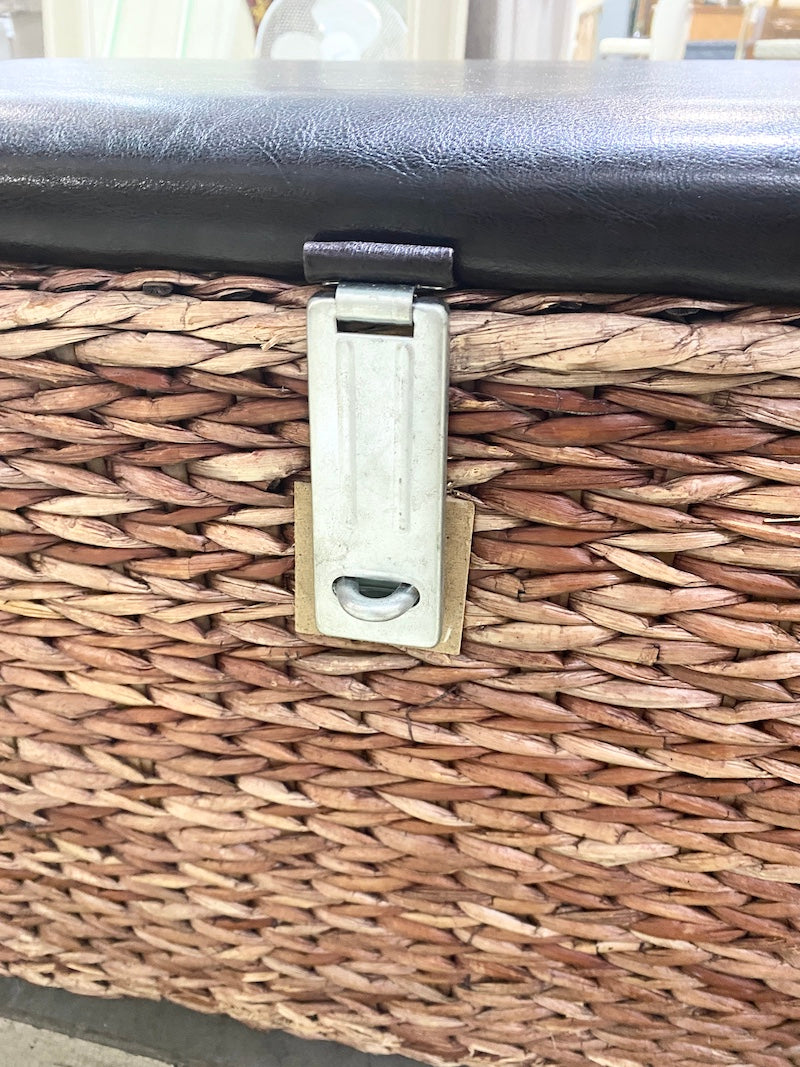 Este prático baú de arrumação combina laterais em folha de bananeira entrançada com um elegante tampo em pele sintética preta e um fecho industrial resistente.