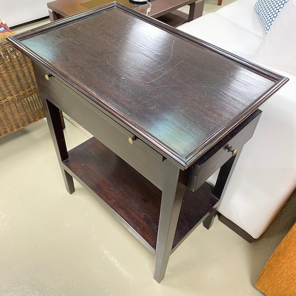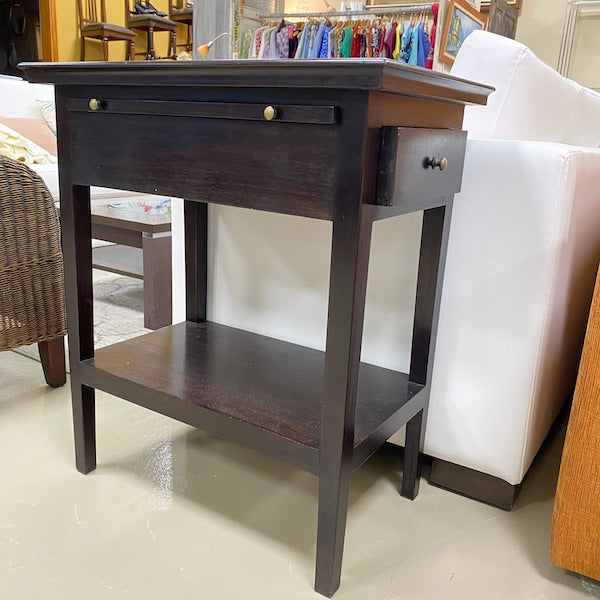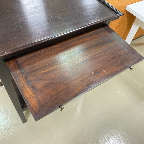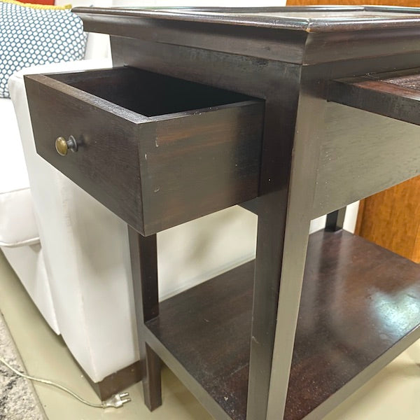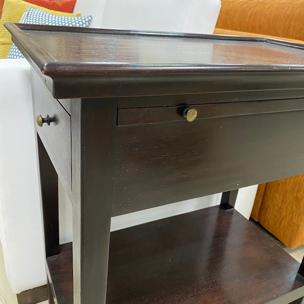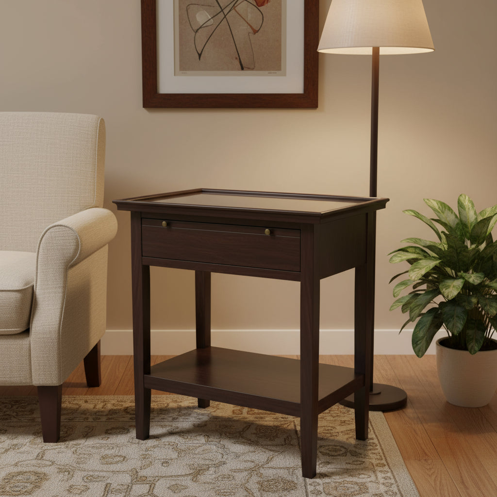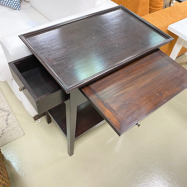 Mesa de apoio em madeira escura com um segredo escondido: o seu tampo desliza para revelar uma secretária oculta. Possui ainda uma gaveta única e uma prateleira inferior para maior praticidade. Em suma, uma peça compacta e prática que se adapta a uma variedade de interiores e espaços pequenos.